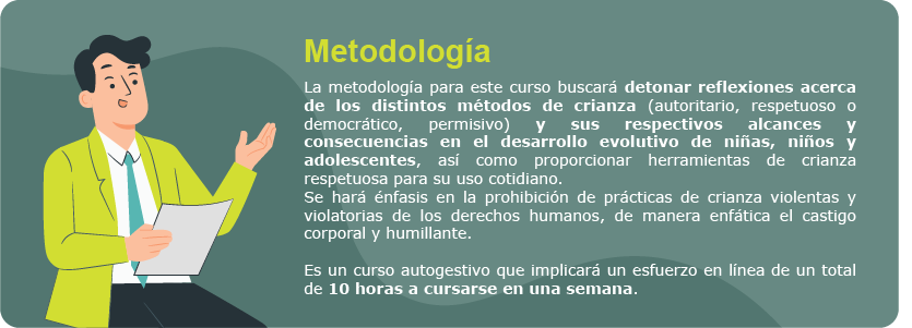Este curso, nos permitirá conocer métodos respetuosos de crianza y construir una base sólida para una crianza más consciente que coadyuve a que las madres, padres o personas cuidadoras asuman el cuidado y la educación de niñas, niños y adolescentes en el ámbito familiar, así como a compartir algunas alternativas y soluciones que pueden poner en marcha en esta gran labor de crianza, que debe de estar libre de violencia y garantizar el pleno reconocimiento de los derechos de las niñas, niños y adolescentes.